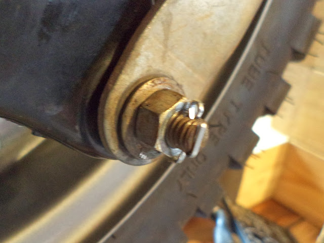 Not enough room for a full cotter pin in the other end of the brake stay. So I did this. Kind of a cotter pin safety wire hybrid. I think the stock stuff are hairpin clips.